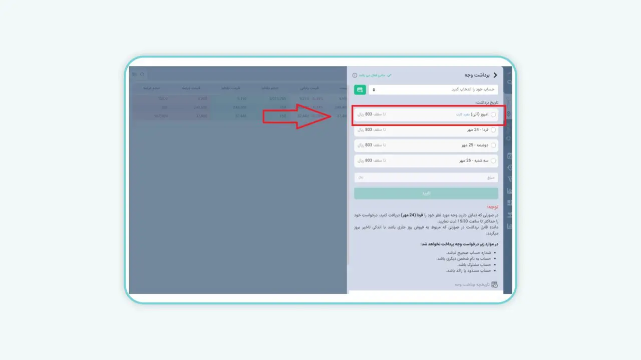 لازم به ذکر است، در صورتی که مبلغ در قدرت خرید از قبل باشد امکان ثبت درخواست وجه تا ساعت ۱۵:۳۰ برای مبالغ کمتر از ۲۰۰ میلیون تومان، برای یک روز کاری بعد وجود دارد.